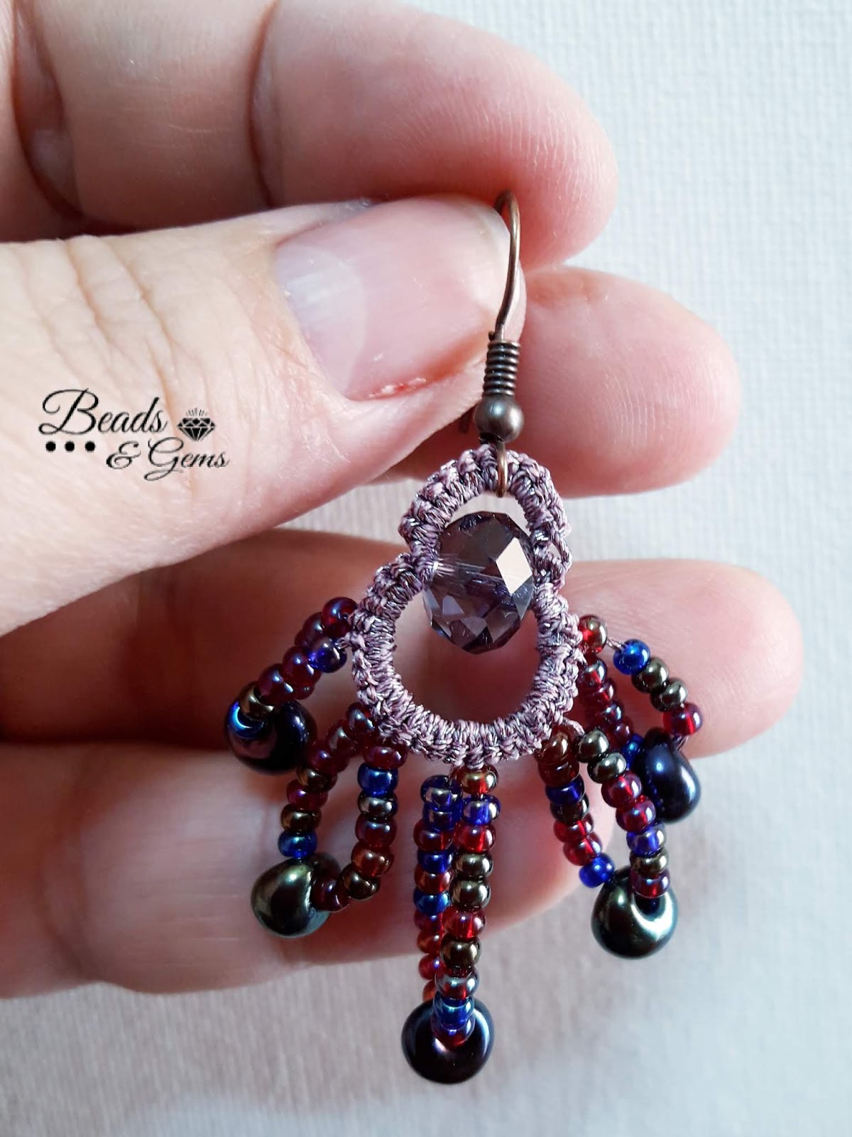 Handmade pendant and earrings set - Bollywood collection - tatted lace - lila metallic thread , 11/o see beads , 6/o preciosa drop beads